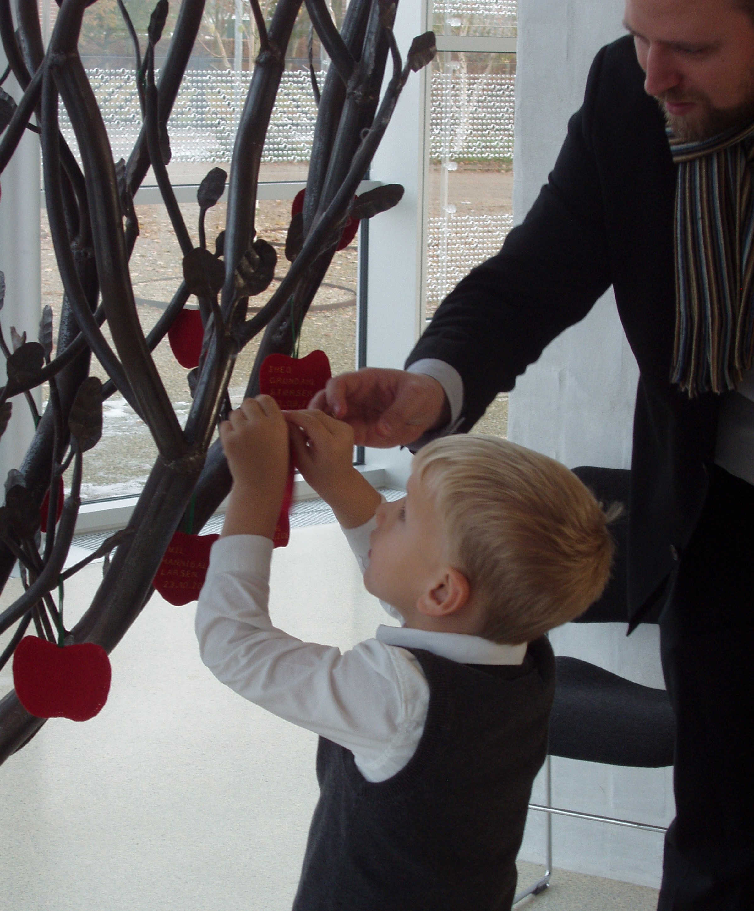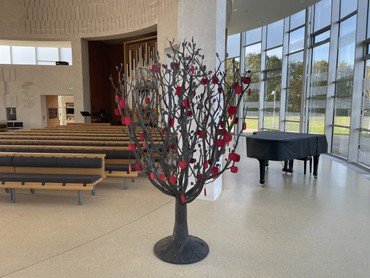Træet fyldes således i løbet af året og når æblerne skal høstes, inviterer vi alle årets mange, dejlige dåbsbørn og deres familie til æblehøstgudstjeneste, hvor hver familie plukker deres barns æble og sognepræsten fortæller om børn, dåbsæbler og æblekage.