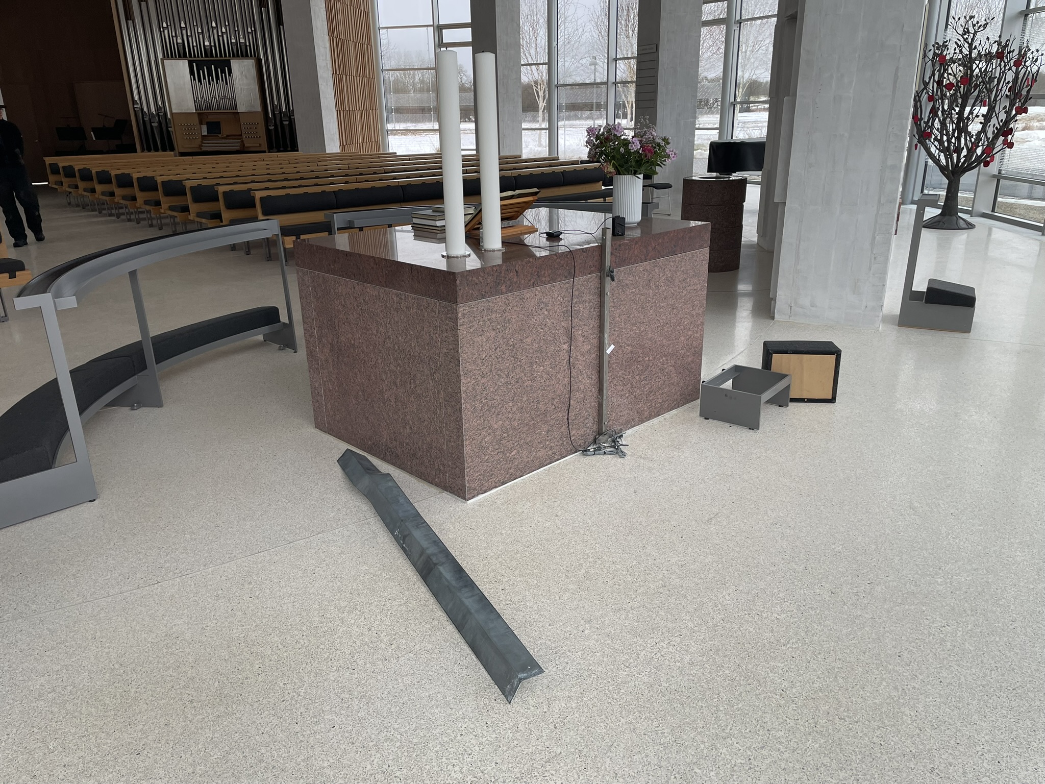 Det er sørgeligt, at nogen kan finde på at stjæle fra en kirke. Vi er vrede, sårede og skuffede, men vi skal videre. Som en midlertidig løsning er der nu sat et trækors på alteret, så kirken som altid har et kors. Dette indtil vi finder en mere permanent løsning.